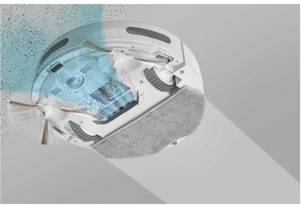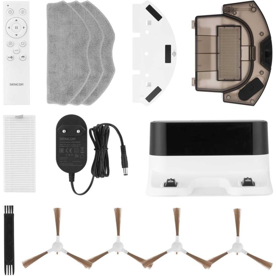 Obsah balení: robotický vysavač včetně dvou bočních kartáčů a filtrů, nabíjecí stanice, dálkový ovladač, mopovací nástavec, 3× mopovací návlek, 2x náhradní boční rotační kartáč, náhradní HEPA filtr, náhradní molitanový filtr, čisticí kartáček, 2× baterie typu AAA