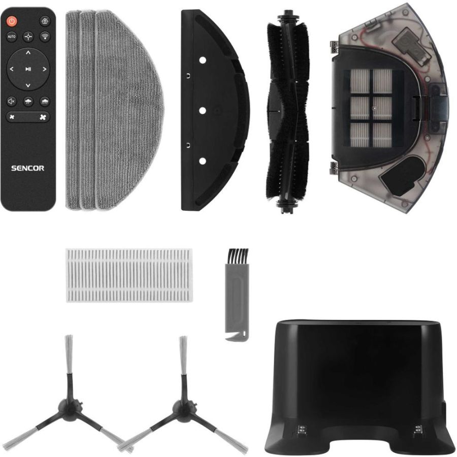 Obsah balení: robotický vysavač včetně bočního kartáče a filtrů, nabíjecí stanice, dálkový ovladač, mopovací nástavec, 3× mopovací návlek, náhradní boční rotační kartáč, náhradní HEPA filtr, náhradní molitanový filtr, čisticí kartáček, 2× baterie typu AAA