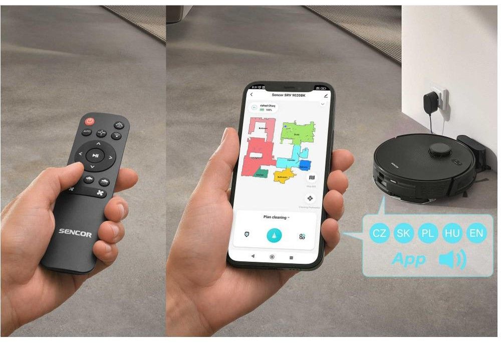K ovládání můžete využít dálkový ovladač nebo pomocí aplikace Sencor Home i mobilní telefon. Připojení přes Bluetooth navíc poskytuje snadné a rychlé spárování. Všechny funkce lze tak aktivovat třeba přímo z práce nebo chaty a na svém telefonu průběžně sledovat úklid vaší domácnosti.