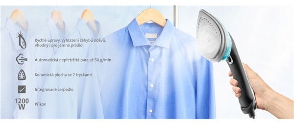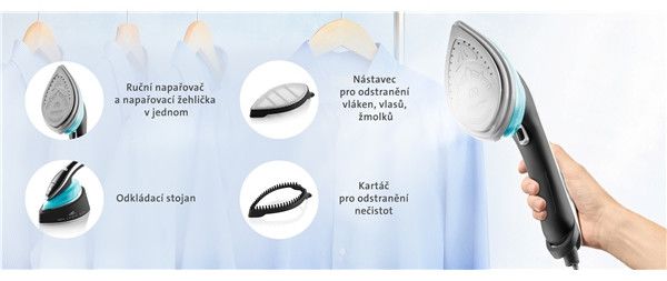 - Pomocí horké páry velmi účinně a rychle zajistí poslední úpravy, vyhlazení záhybů i odstranění nečistot na oděvu