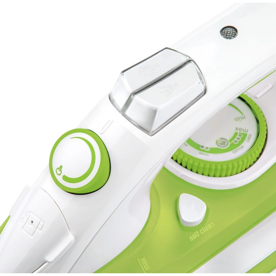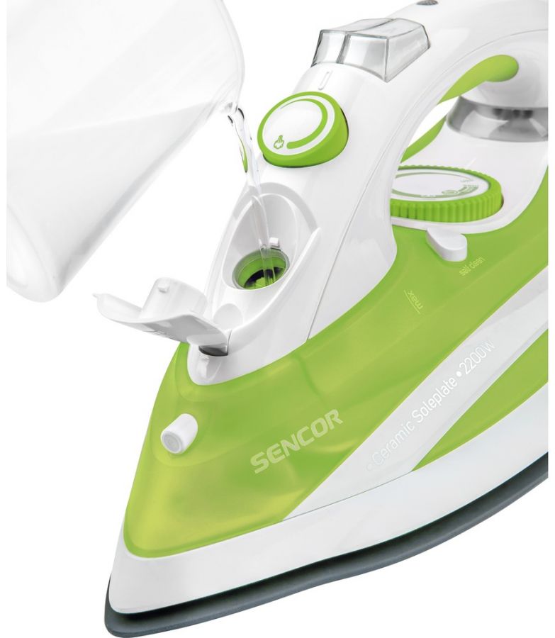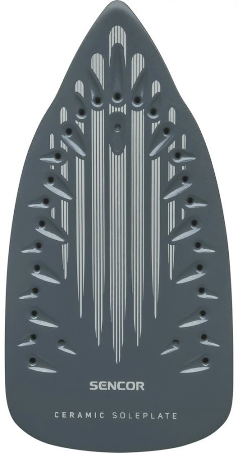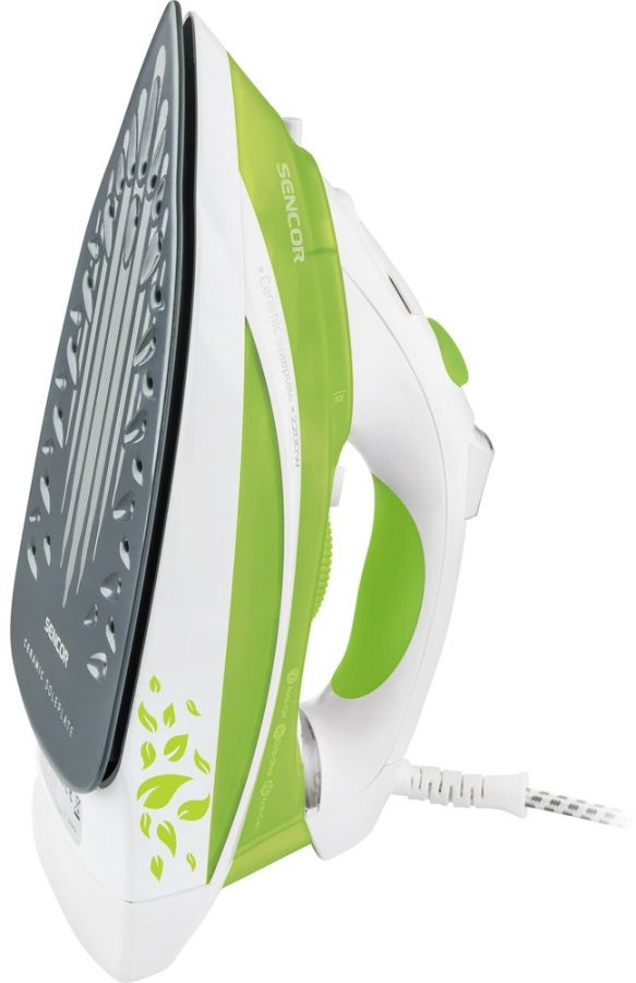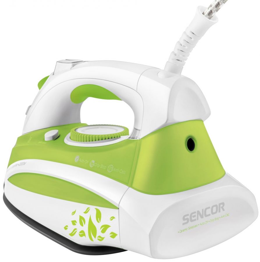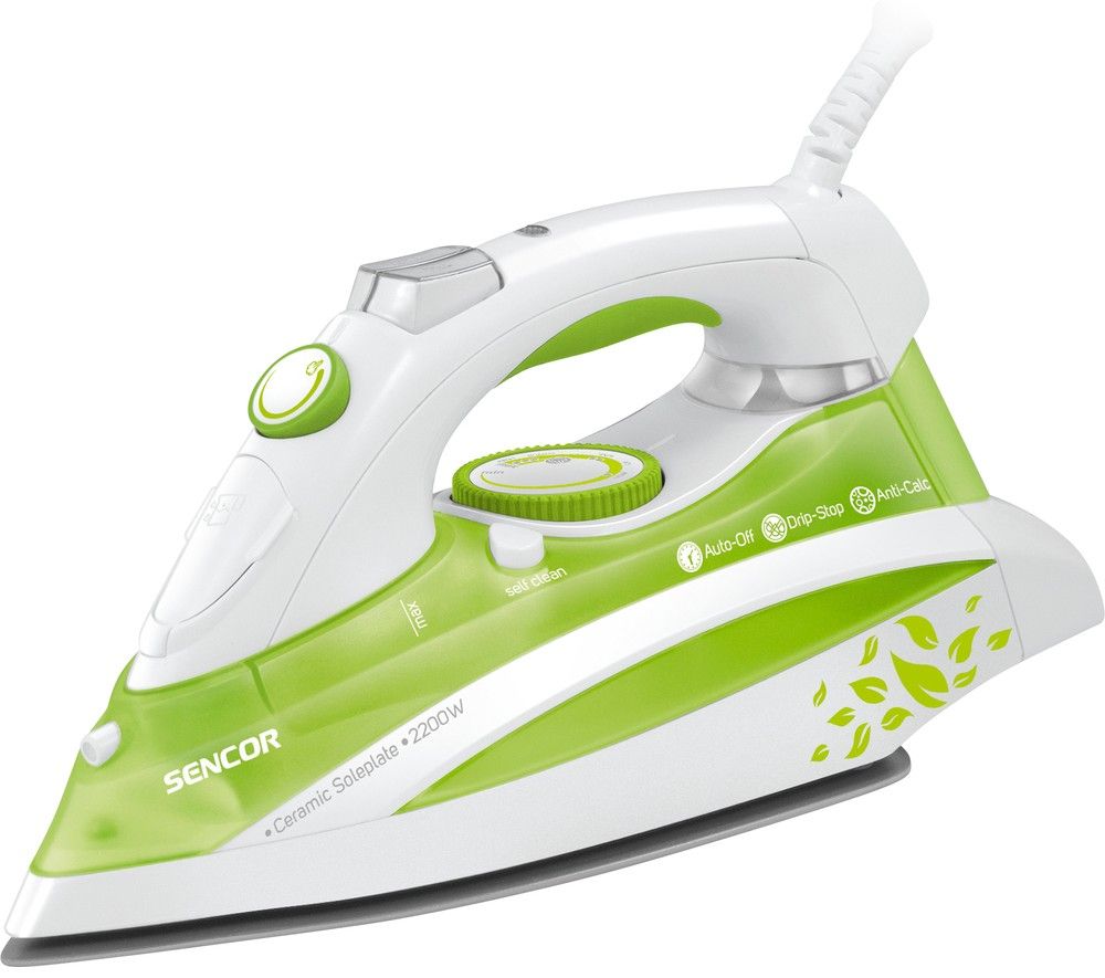 Napařovací žehlička s keramickou žehlící plochou, se systémem samočištění Self-cleaning a Anti-Calc zamezující tvorbě vodního kamene v otvorech žehlící desky, funkcí Drip-Stop, plynulou regulací teploty a výstupu páry.