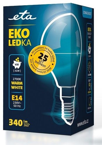 EKO LEDka (ETAP45W4WW01) je mléčná 4W LED žárovka s paticí E14 a vstupním napětí 230V. Světelný tok žárovky je 340 Lm s úhlem svítivosti 360°. Její světlo řadíme mezi teplé bílé (o teplotě 2700K) a je alternativou klasické 31W žárovky. Rozměry žárovky jsou 45x78 mm.