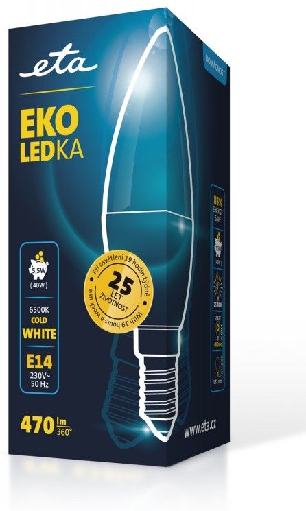EKO LEDka (ETAC37W55CW01) je mléčná 5,5W LED žárovka s paticí E14 a vstupním napětí 230V. Světelný tok žárovky je 470 Lm s úhlem svítivosti 360°. Její světlo řadíme mezi studené bílé (o síle 6500K) a je alternativou klasické 40W žárovky. Rozměry žárovky jsou 37x100 mm.