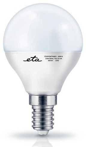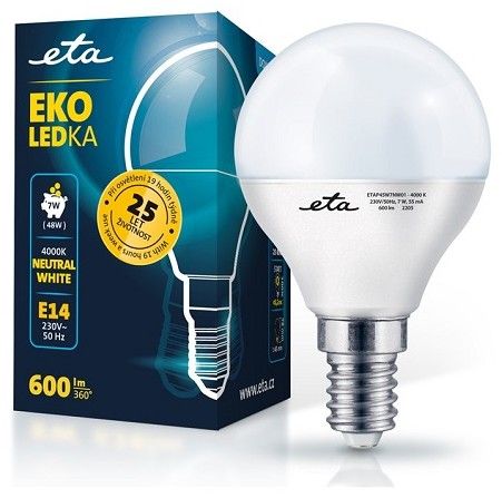 EKO LEDka (ETAP45W7NW01) je mléčná 7W LED žárovka s paticí E14 a vstupním napětí 230V. Světelný tok žárovky je 600 Lm s úhlem svítivosti 360°. Její světlo řadíme mezi neutrální bílé (o teplotě 4000K) a je alternativou klasické 48W žárovky. Rozměry žárovky jsou 45x86 mm.