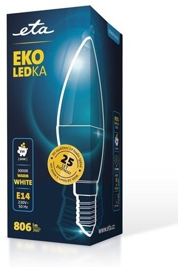 EKO LEDka (ETAC37W8WW01) je mléčná 8W LED žárovka s paticí E14 a vstupním napětí 230V. Světelný tok žárovky je 806 Lm s úhlem svítivosti 360°. Její světlo řadíme mezi teplé bílé (o síle 3000K) a je alternativou klasické 60W žárovky. Rozměry žárovky jsou 37x108 mm