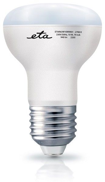 EKO LEDka (ETAR63W10WW01) je mléčná 10W LED žárovka s paticí E27 a vstupním napětí 230V. Světelný tok žárovky je 940 Lm s úhlem svítivosti 360°. Její světlo řadíme mezi teplé bílé (o teplotě 2700K) a je alternativou klasické 68W žárovky. Rozměry žárovky jsou 63x105 mm.