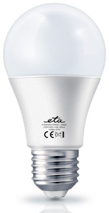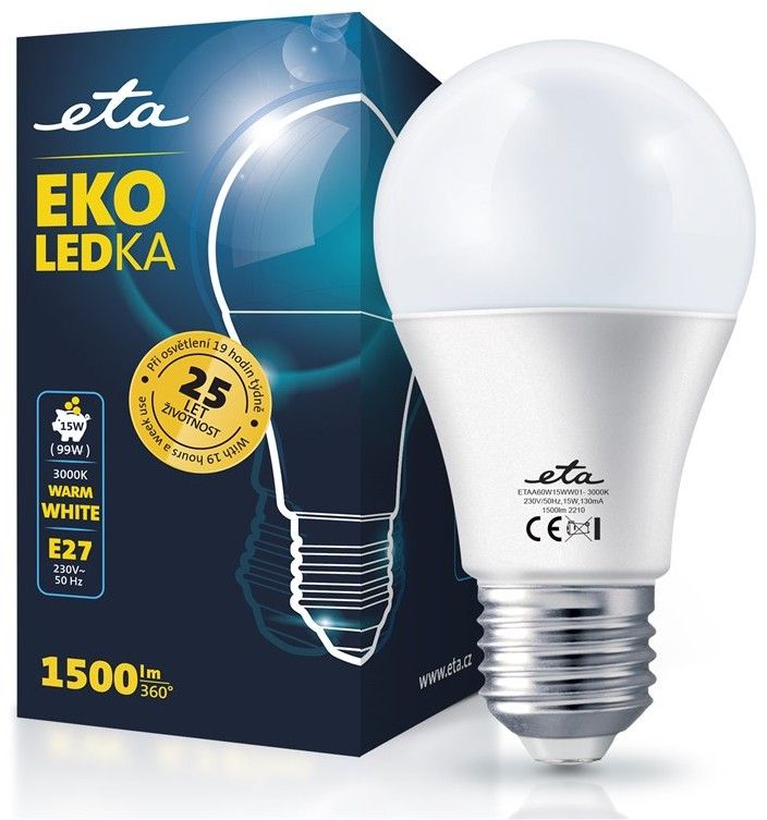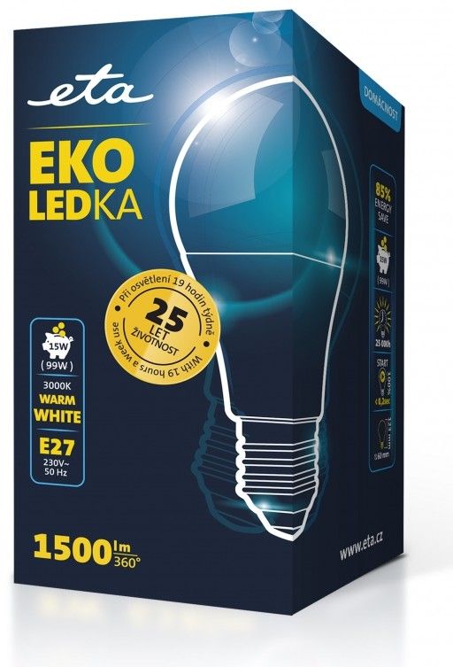 EKO LEDka (ETAA60W15WW01) je mléčná 15W LED žárovka s paticí E27 a vstupním napětí 230V. Světelný tok žárovky je 1500 Lm s úhlem svítivosti 360°. Její světlo řadíme mezi teplé bílé (o síle 3000K) a je alternativou klasické 99W žárovky. Rozměry žárovky jsou 60x123 mm.