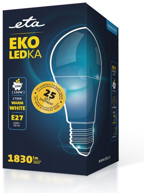 EKO LEDka (ETAA70W18WW01) je mléčná 18W LED žárovka s paticí E27 a vstupním napětí 230V. Světelný tok žárovky je 1055 Lm s úhlem svítivosti 360°. Její světlo řadíme mezi teplé bílé (o síle 2700K) a je alternativou klasické 150W žárovky. Rozměry žárovky jsou 70x142 mm.
