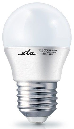 EKO LEDka (ETAG45W7NW01) je mléčná 7W LED žárovka s paticí E27 a vstupním napětí 230V. Světelný tok žárovky je 600 Lm s úhlem svítivosti 360°. Její světlo řadíme mezi neutrální bílé (o teplotě 4000K) a je alternativou klasické 48W žárovky. Rozměry žárovky jsou 45x82 mm.