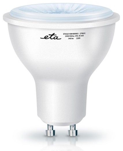 EKO LEDka (ETAGU10W4WW01) je mléčná 4W LED žárovka s paticí GU10 a vstupním napětí 230V. Světelný tok žárovky je 340 Lm s úhlem svítivosti 360°. Její světlo řadíme mezi teplé bílé (o teplotě 2700K) a je alternativou klasické 31W žárovky. Rozměry žárovky jsou 50x54 mm.