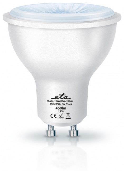 EKO LEDka (ETAGU10W6WW) je mléčná 6W LED žárovka s paticí GU10 a vstupním napětí 230V. Světelný tok žárovky je 450 Lm s úhlem svítivosti 110°. Její světlo řadíme mezi teplé bílé (o síle 2700K) a je alternativou klasické 35W žárovky. Rozměry žárovky jsou 50x56 mm.