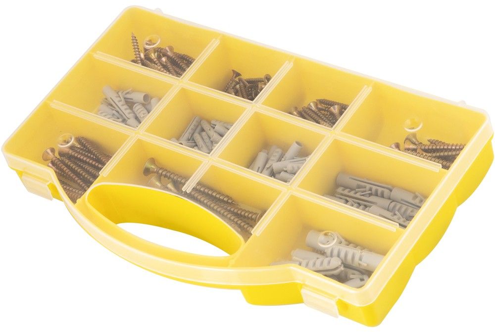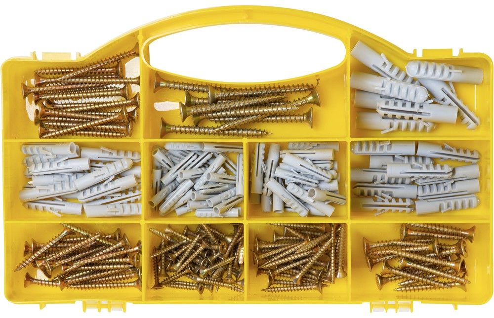 Praktická sada vrutů a hmoždinek vám nabídne ten správný materiál na připevnění různého příslušenství. Sada je uložena v elegantním a kompaktním plastovém kufříku a obsahuje celkem 206 ks.