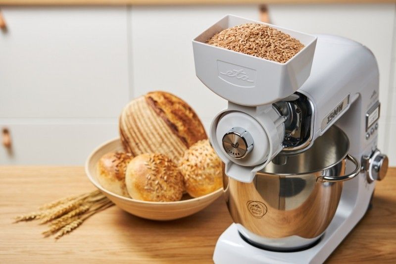 Mlýnek na obiloviny, luštěniny - sóju/cizrnu a rýži pro zdravé domácí vaření z celozrnné nebo bezlepkové mouky - rozšíří funkce vašeho kuchyňského robota ETA Gratus Kuliner, Gratus, Gratussino, Gustus, Meno a Mezo.