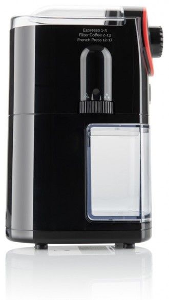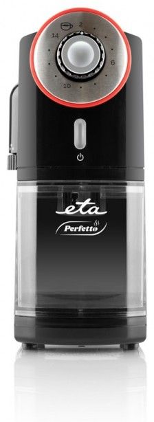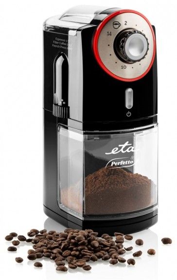 Kávomlýnek Perfetto se 17 stupni jemnosti mletí s příkonem 100 W. Obsah násypky 200 g, 2 mlecí kameny o průměru 40 mm.