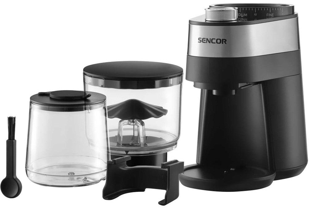 Obsah balení: Elektrický mlýnek na kávu, Držák na portafiltr, Krabička na zrnkovou kávu, Nádoba na kávový prášek, Čisticí kartáček