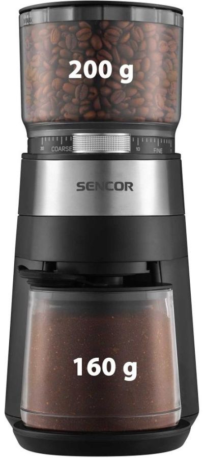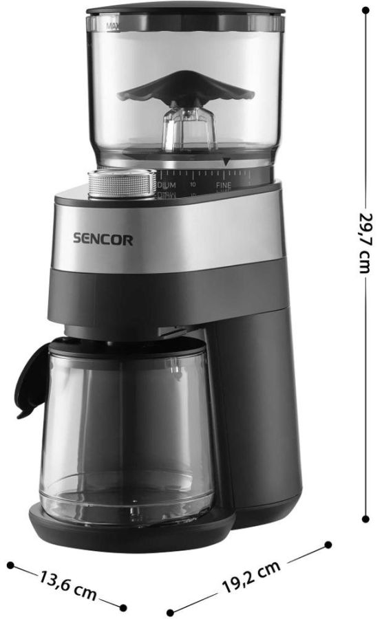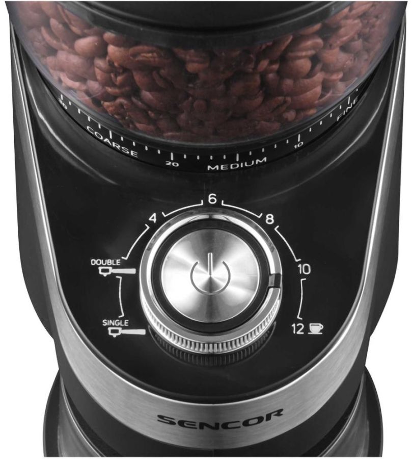 Elektrický mlýnek na kávu má mlecí kameny z oceli které zajišťující rychlé a přesné mletí, 30 nastavení mletí od jemného po hrubé a otočný volič pro nastavení porcí od 1 do 12 šálků s funkcí automatického zastavení.
