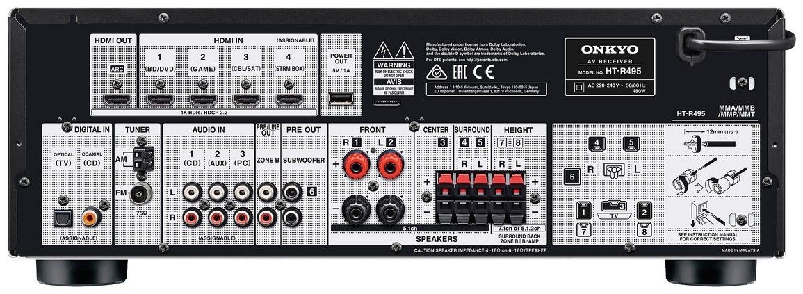 Domácí kino 5.1; receiver: 135W/k/6Ω, HDMI (4in, 1out, 4K/60Hz, HDCP2.2, HDR), Bluetooth, dekodéry HD audio formátů, 384kHz/32bit DAC, zóna B; reproduktory s matným černým povrchem lze zavěsit na zeď, 120W subwoofer s bassreflexem