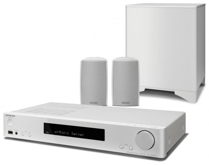 Síťový stereo receiver s reproduktory a bezdrátovým subwooferem.