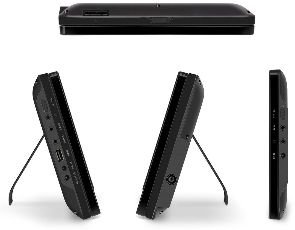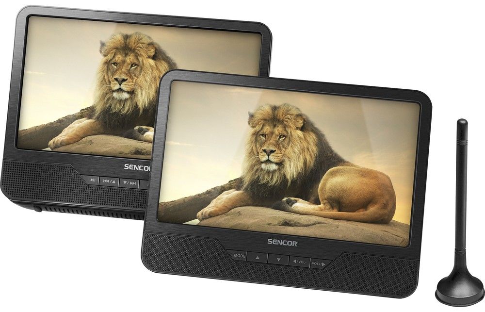 Duální přenosný DVD přehrávač s úhlopříčkou 9", rozlišením 800x480 pixelů, DVB-T (MPEG4) tunerem a slotem pro kartu SD (podporovanou až do 32 GB).