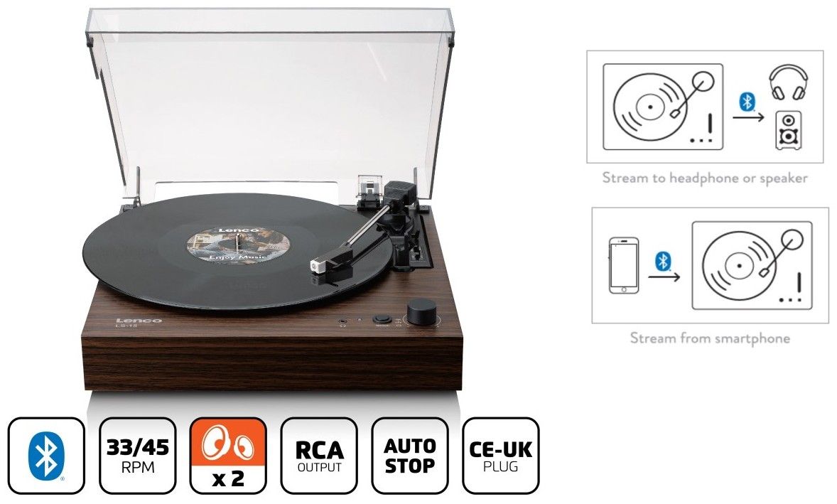 Máte doma gramofonové desky a chcete si je přehrávat ? Gramofon Lenco LS-15WD je pro Vás jako stvořený. Má vestavěné dva reproduktory, takže stačí jen zapojit do zásuvky, pložit desku a můžete začít přehrávat. Pokud chcete poslouchat jen do sluchátek, zapojíte je do konektoru 3,5 mm jack, nebo můžete připojit i bezdrátová Bluetooth sluchátka. Pomocí Bluetooth lze připojit také bezdrátový Bluetooth reproduktor a poslouchat přehrávanou hudbu z něj. Navíc můžete streamovat svoji hudbu z jiných zařízení přes Bluetooth do gramofonu a přehrávat ji z reproduktorů gramofonu.