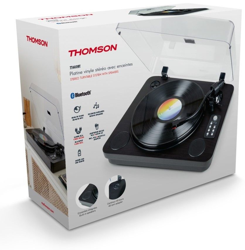 Gramofon Thomson TT650BT stačí vybalit z krabice, zapojit do elektrické zásuvky a můžete začít přehrávat. Je to tak jednoduché. Gramofon má totiž zabudovaný zesilovač i dva reproduktory. Přehrávat můžete vaše vinyly, streamovat hudbu přes Bluetooth do gramofonu, nebo připojit USB flash disk a přehrávat MP3.