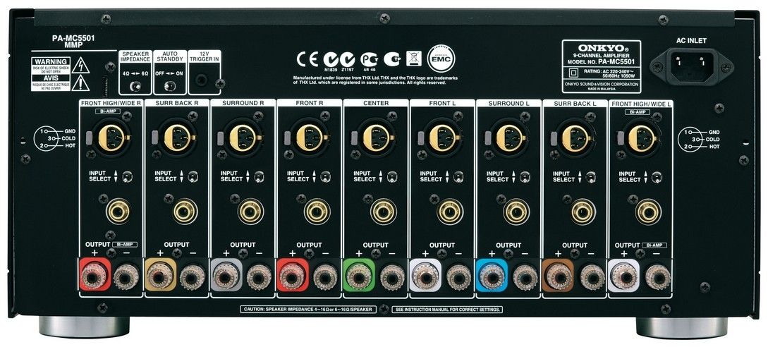 9 - kanálový koncový AV zesilovač (např. ke kontrolerům PR-SC55xx), 220W/ch, THX Ultra 2+, XLR & cinch, 12V Trigger, Auto-off.