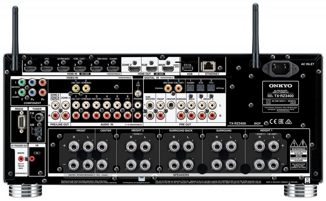 11.2, 260W/k/6Ω, THX ULTRA, HDMI (7in, 3out, HDCP2.3, 4K/60p, HDR10), BT, WiFi (AirPlay, GoogleCast; Spotify, TIDAL, TuneIn), USB, DTS:X a D.Atmos 7.2.4, 11.2 Pre-Out, 384kHz/32bit DAC a VLSC, HiFi konstrukce, RS-232, Hi-Res Audio, kal. mikr., zóna2/3
