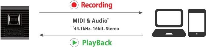 Připojením k počítači nebo iPadu či iPhonu (pomocí vestavěného portu USB to Host) můžete nahrávat i vysoce kvalitní audio nahrávky bez nutnosti dalšího externího zařízení (jako je např. zvuková karta). Možnosti nástroje tak můžete rozšířit pomocí mnoha zajímavým aplikací Yamaha, které naleznete v obchodě App Store.