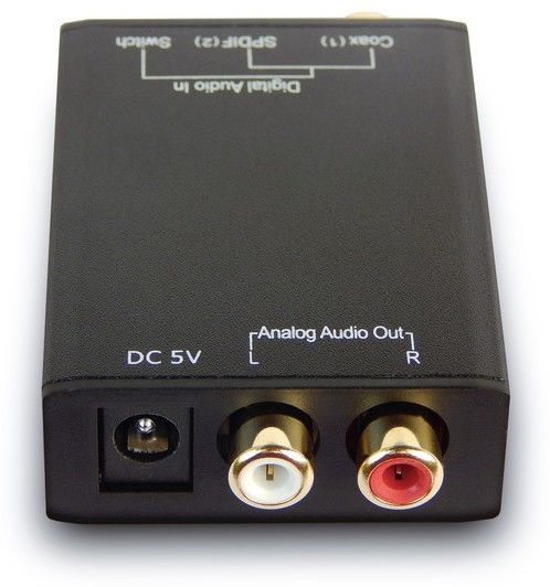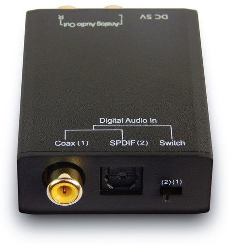 DA převodník má dva digitální vstupy: 1x optický, 1x digitál koax (RCA) a analogový výstup stereo 2x RCA (cinch).