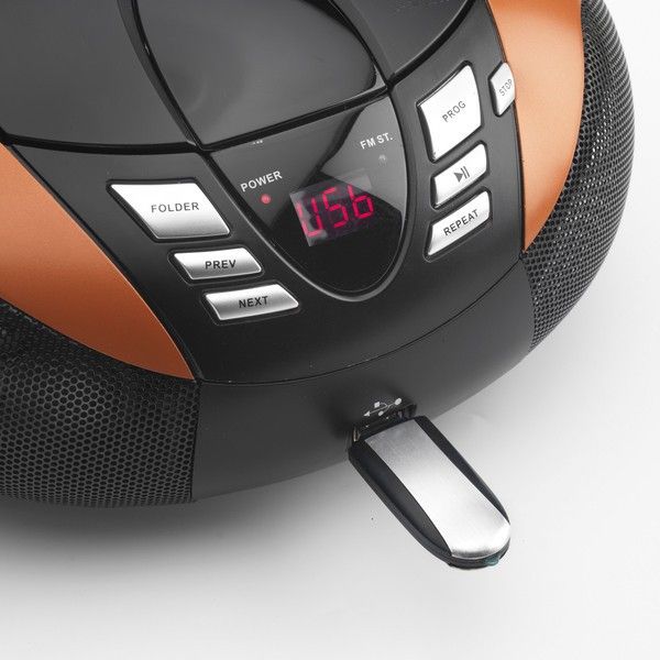 Přenosný CD/MP3 přehrávač s FM rádiem a USB vstupem.