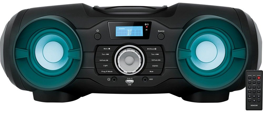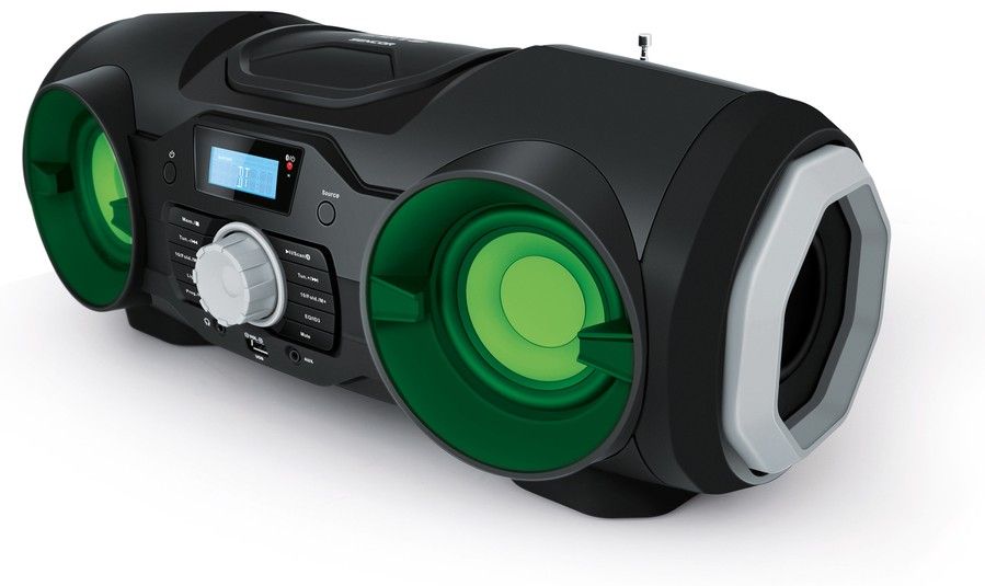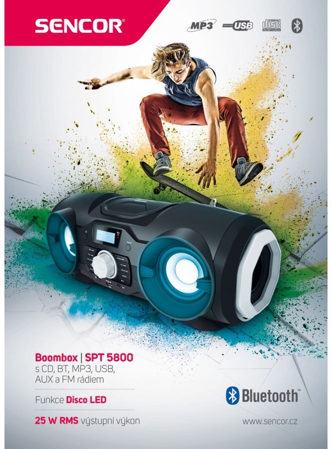 Boombox s CD, BT, MP3, USB a AUX. Má výstupní výkon 25W RMS (2x 12,5W) a funkci Disco LED (7 barev) s režimem blikání. Přehrává CD-R/RW, Bluetooth, MP3 a USB.