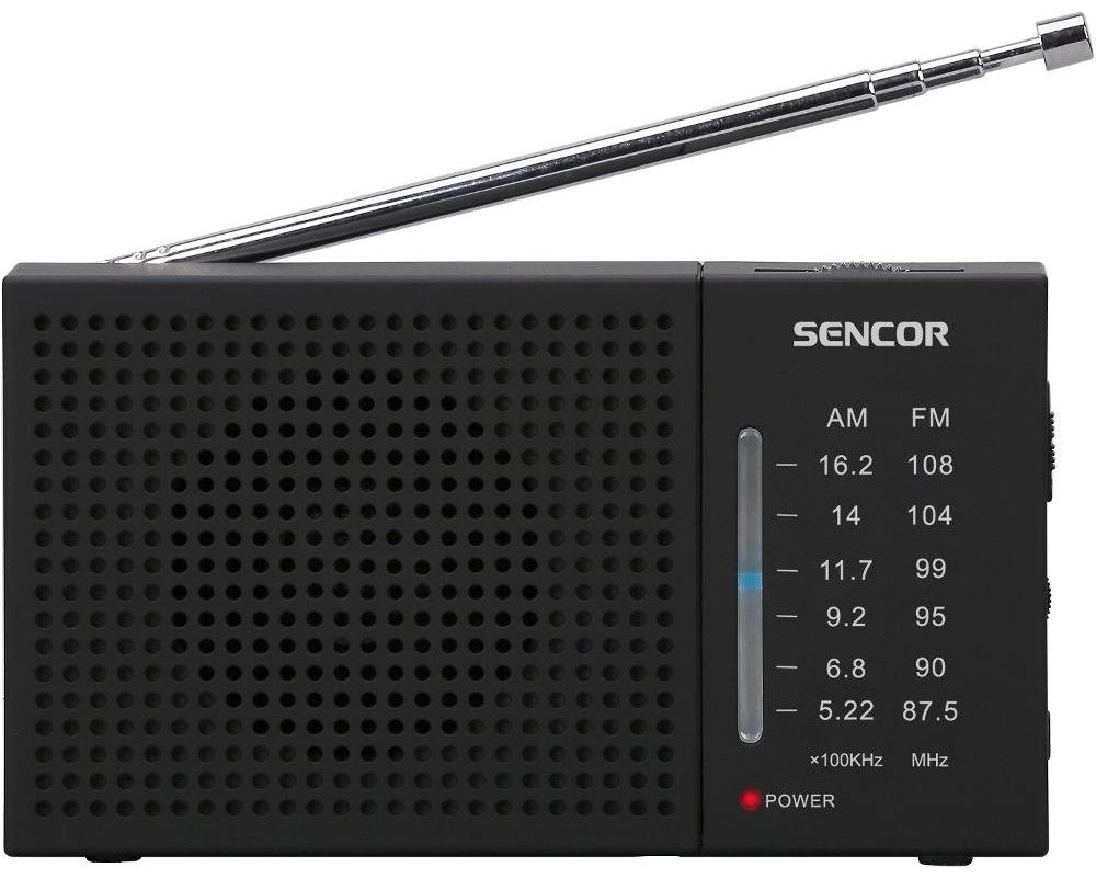 Přenosný radiopřijímač s FM, AM, teleskopickou anténou a konektorem 3,5mm pro sluchátka.