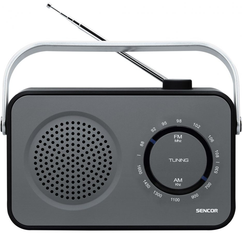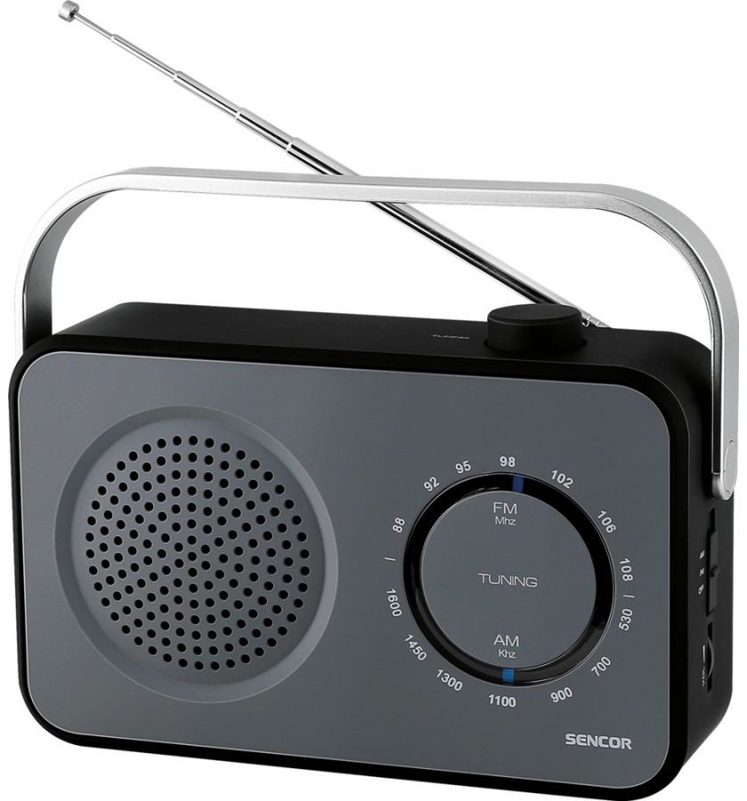 Přenosný radiopřijímač s FM teleskopickou anténou a konektorem 3,5mm pro sluchátka.