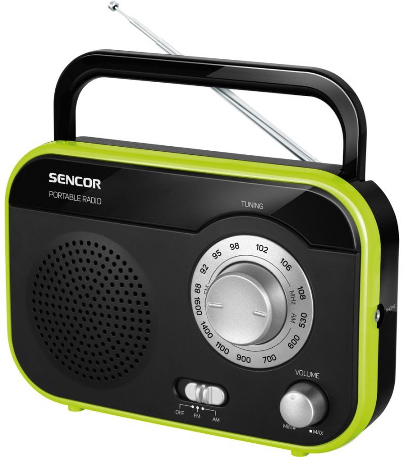 Přenosný radiopřijímač s FM teleskopickou anténou a konektorem 3,5mm pro sluchátka.