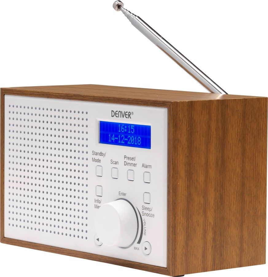 Provedení ve stylovém dřevěném korpusu dělá z přísroje Denver líbivý doplněk do interiéru. Čelní straně dominuje modře podsvícený LCD displej a vestavěná ovládací tlačítka. Radiopřijímač Denver DAB-42 umí hrát pořádně nahlas díky zabudovanému 2W reproduktoru. Vhod přijde funkce dvojitého budíku, zobrazení hodin, nastavení časovače zapnutí, Snooze, Sleep a možnost síťového nebo bateriového napájení.