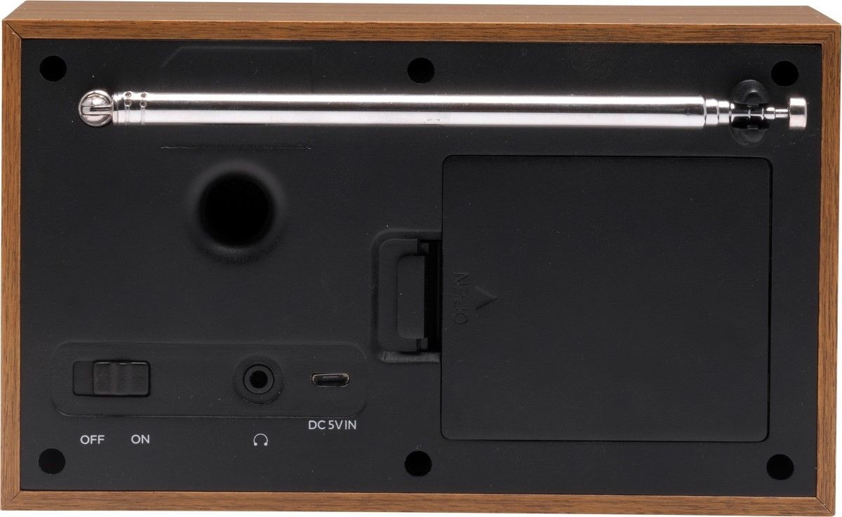 Přenosné rádio s DAB+ a FM tunerem s funkcí budíku ve stylovém dřevěném korpusu.