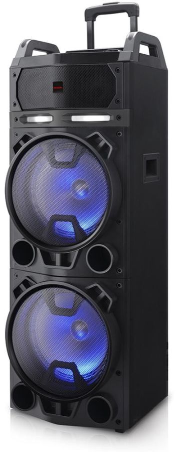 Přenosný Bluetooth party reproduktor s výkonem 100W, dosahem až 10 metrů, kytarovým vstupem a audio výstupem.