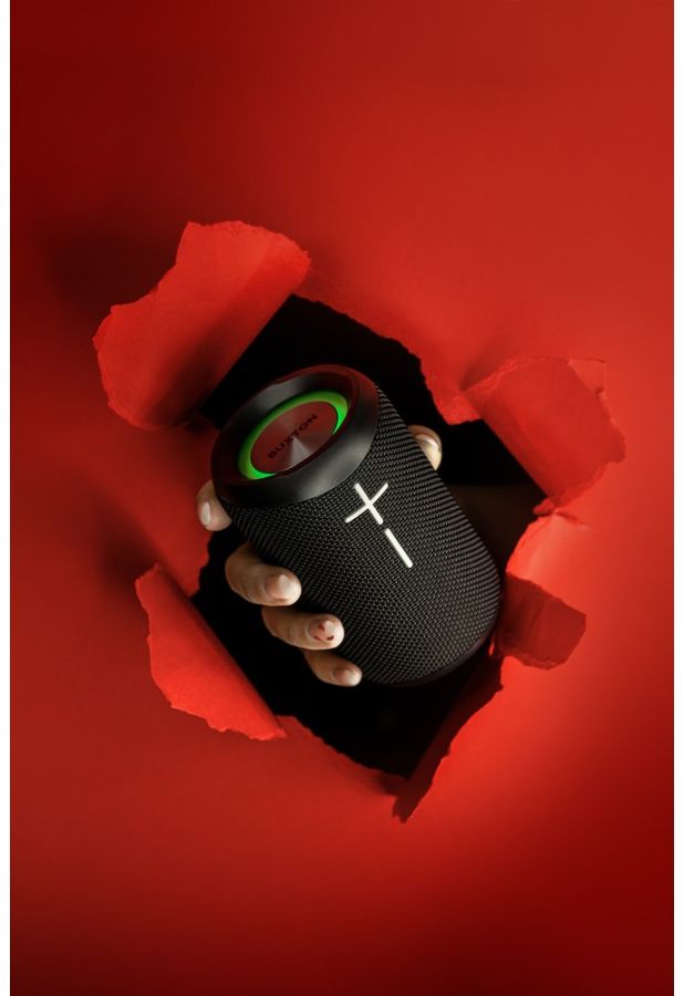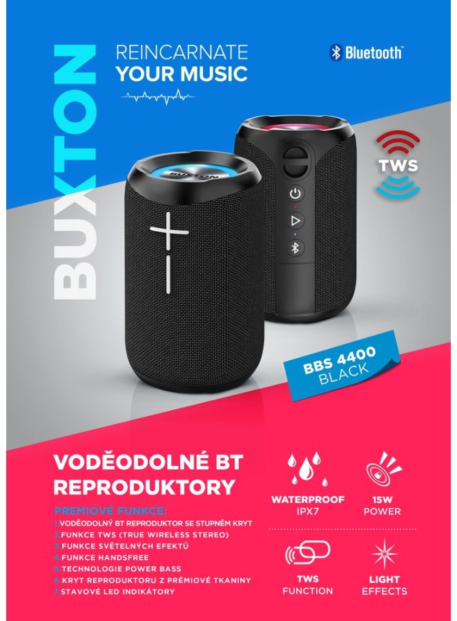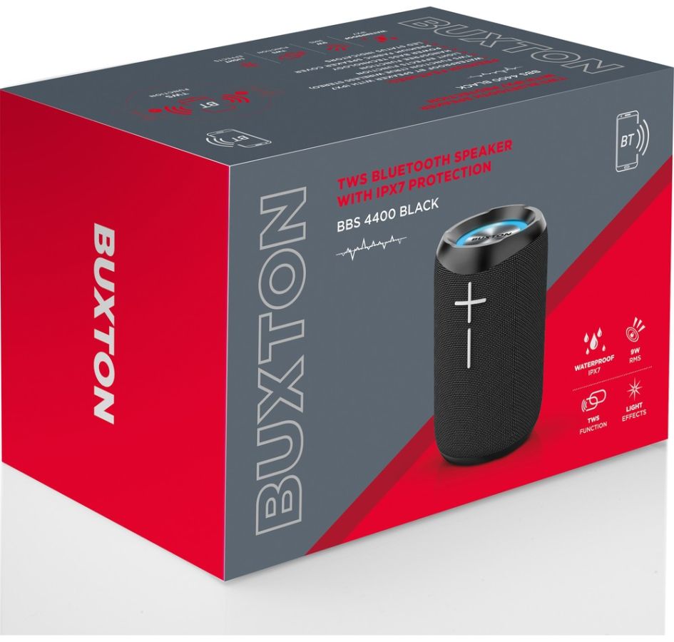 K tomu všemu si ještě přidejte, že Buxton BBS 4400 je dokonale voděodolný. Reproduktor vyhovuje stupni IPX7, takže i kdybyste reproduktor ponořili na půl hodiny metr pod hladinu vody – ani si toho nevšimne a hraje dál! Navíc je to elegantní týpek – oblečený je do prémiové tkaniny, se světelnými efekty, integrovaným mikrofonem, AUX vstupem a handsfree funkcí