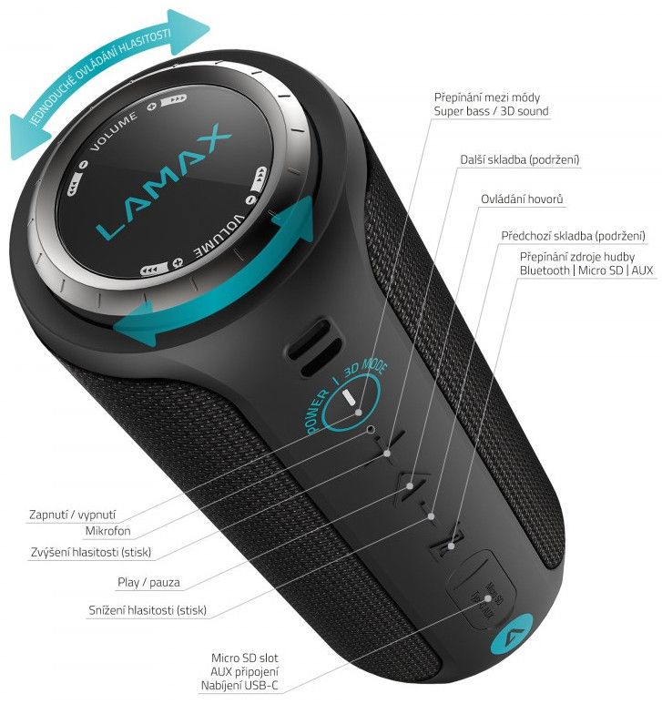 - Funkce: 360° zvuk, Bluetooth, AUX, Micro SD karta, TWS, NFC, 3D Sound, Handsfree, USB-C