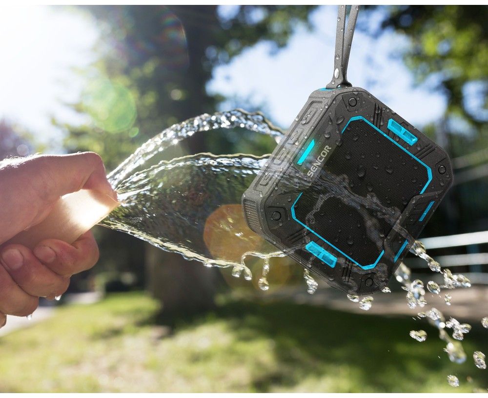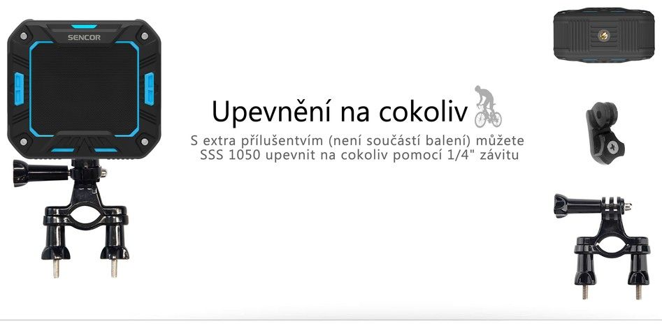 Kompaktní voděodolný reproduktor, se kterým si můžete pouštět svoji oblíbenou hudbu z Vašeho telefonu či tabletu pomocí bezdrátové technologie Bluetooth s dosahem až 15 metrů. O silný a čistý zvuk se postarají dva reproduktory o maximálním výkonu 5W. Konstrukce reproduktoru je navržená proti dešti či stříkající vodě. Již se nemusíte bát, poslouchat hudbu v nepříznivém počasí či u bazénu. Díky velké dobíjecí baterii nabízí reproduktor přehrávání hudby až 13 hodin. Reproduktor je vybaven 1/4" závitem, pomocí kterého lze reproduktor upevnit například na kolo, loď nebo kamkoliv budete chtít. SSS 1050 pro Vás může být perfektním společníkem v jakékoli situaci a kamkoli jdete.