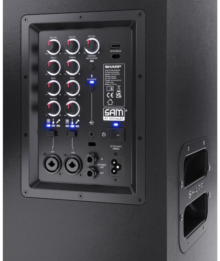 Pro-panel se 3 vstupními kanály: TRS/XLR combo (×2) s nastavením Reverb, Basy & Výšky a Aux/Bluetooth, vše s nezávislým ovládáním úrovně.