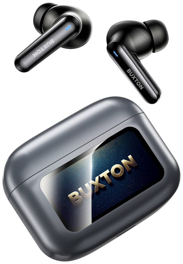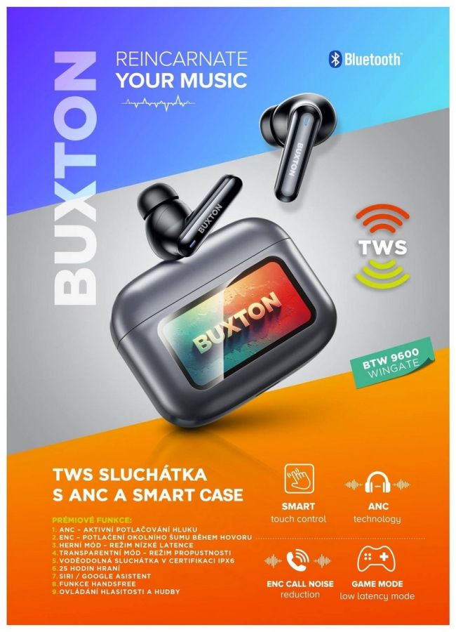 Sluchátka BUXTON WINGATE obdržíte společně s chytrým pouzdrem Smart case. Mezi funkce tohoto pouzdra s displejem patří vyhledání sluchátek pomocí tónu, ekvalizér, virtuální prostorový zvuk, zobrazení času, spoušť fotoaparátu či svítilna. Sluchátka umožňují chytré dotykové ovládání poslechu a hovorů.