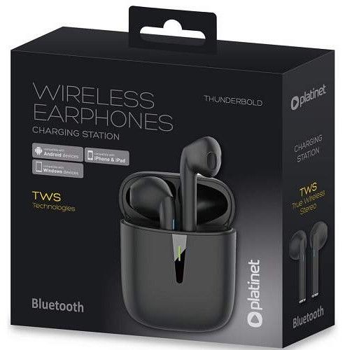 Skutečně bezdrátová sluchátka Platinet PM1010 s technologií Bluetooth 5.0 a nabíjecím pouzdrem. Výdrž baterie na jedno nabití 3 hodiny.