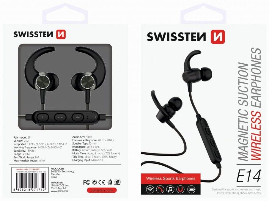 Bezdrátová bluetooth sluchátka Swissten Active jsou určena pro všechny vyznavače sportovních aktivit vyžadujících dynamický pohyb. Díky kabelu za krkem a speciálním háčkům určených do uší nevypadnou ani při běhu či skákání. Špunty navíc dostanete v balení ve 3 velikostech, ze kterých si můžete vybrat tu, která bude vašemu uchu vyhovovat nejlépe. Jestliže vás překvapí telefonát v průběhu pohybu, můžete hovor bez obav přijmout stiskem ovládacího tlačítka na spojovacím kabelu.