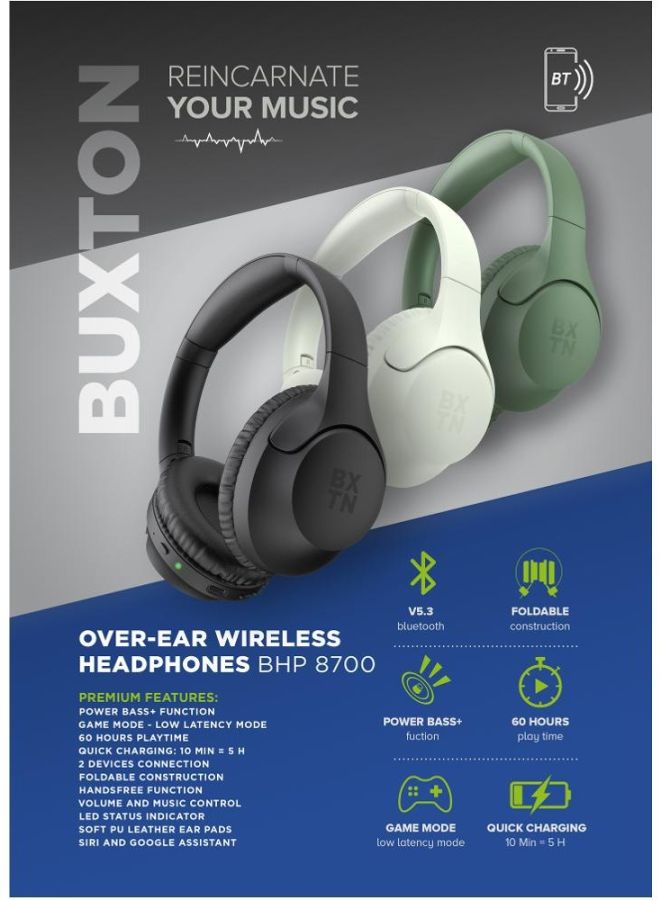 Sluchátka BT Buxton BHP 8700 Green nabízí řadu výjimečných funkcí, které vám dopřejí maximální zážitek. Funkce Power Bass+ povznese prožitek z poslechu hudby nebo sledování filmů na novou úroveň. Herní režim s nízkou latencí je přesně to, co potřebujete, pokud si chcete užít gaming na maximum. Až 60 h hraní a rychlé nabíjení umožňuje celodenní provoz. Pokud patříte do skupiny uživatelů, kteří zapomínají na to, že je potřeba zařízení občas také nabít, tak nezoufejte. Stačí 10 minut dobíjení a máte záruku dalších až 5 hodin provozu. Možnost připojení dvou zařízení a podpora hlasových asistentů, jako je Siri a Google Assistant, jsou benefity, které také dozajista oceníte