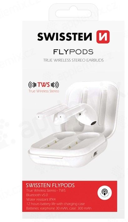 Bezdrátová Bluetooth sluchátka Swissten Flypods s dobíjecím pouzdrem.