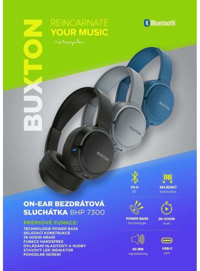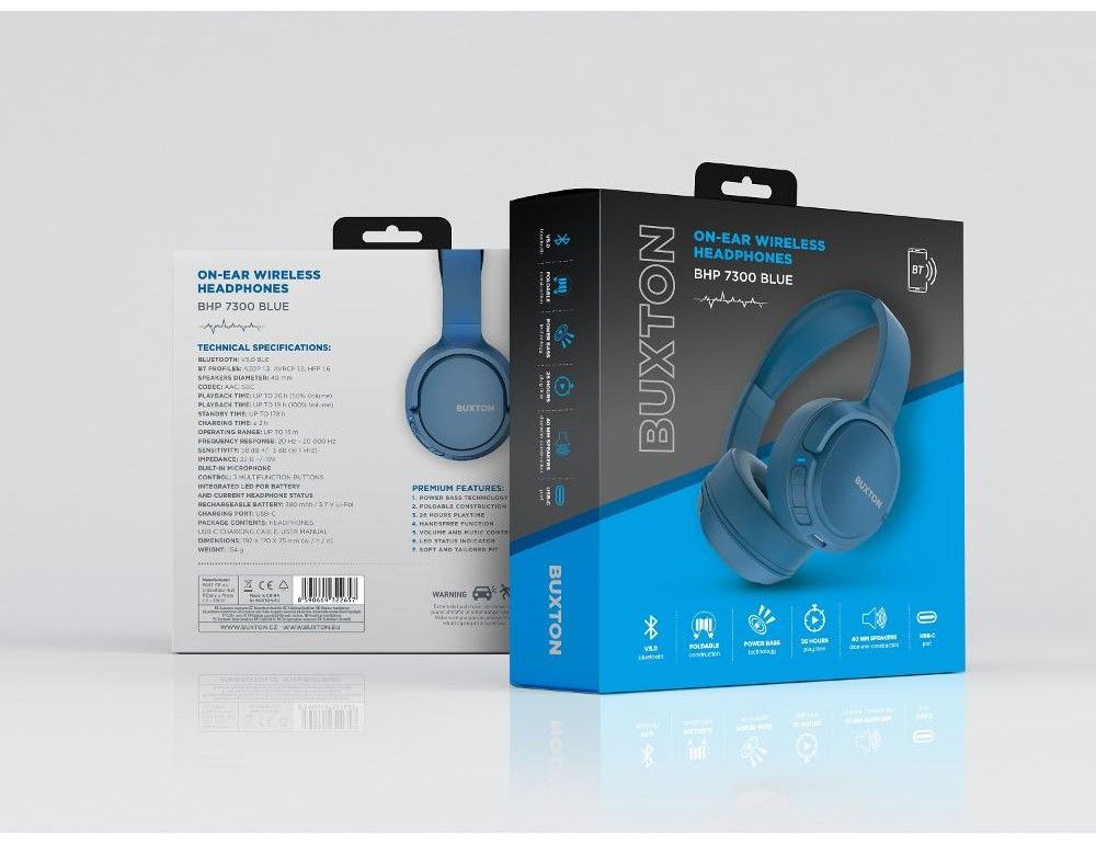 Sluchátka Buxton BHP 7300 snadno připojíte přes Bluetooth V5.0 BLE s dosahem patnácti metrů od zdroje. Skvělé je ovládání hlasitosti přímo na sluchátkách, integrovaný mikrofon, tři multifunkční ovládací tlačítka, funkce handsfree i LED dioda která vás kdykoli informuje o stavu baterie a aktuálním stavu sluchátek. Sluchátka, která nabijete přes USB-C port za necelé dvě hodiny, vydrží hrát při zvolené maximální hlasitosti celých 19 hodin a při poloviční hlasitosti dokonce až 26 hodin!