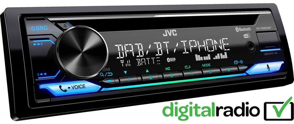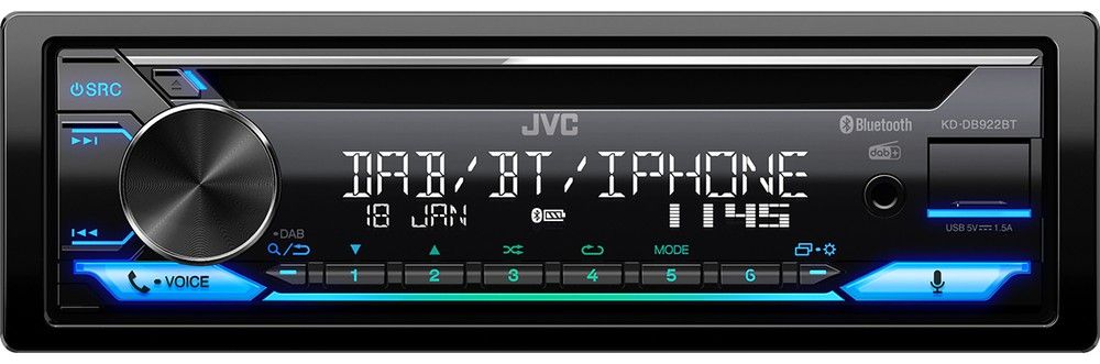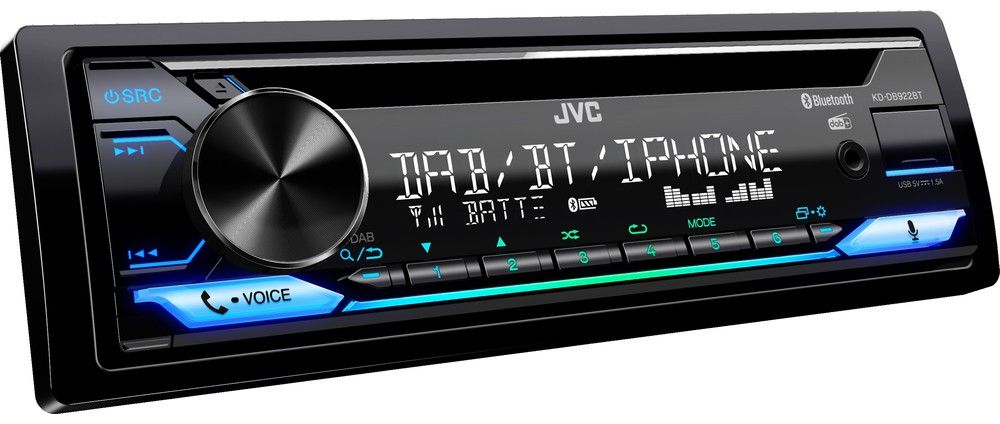Autorádio s CD přehrávačem a technologií Bluetooth, přehrává CD/MP3/WMA/WAV/FLAC/AAC, podpora Amazon Alexa, přehrávání hudby Android, automatické párování s iPhonem, Spotify Control a JVC aplikace dálkového ovládání.