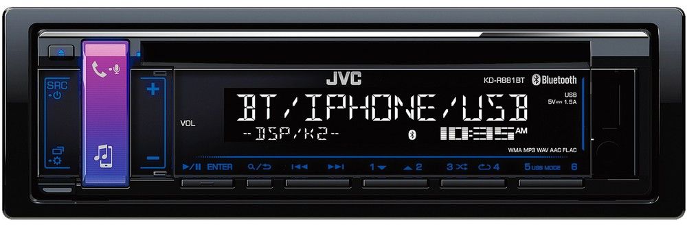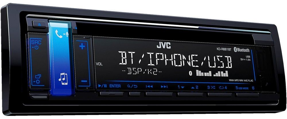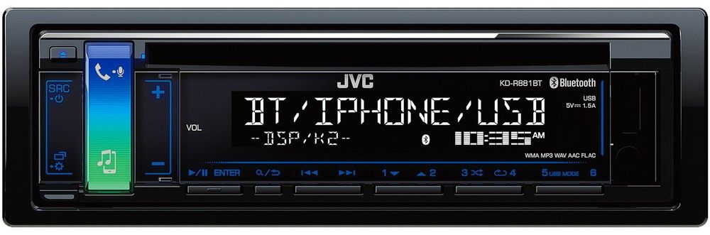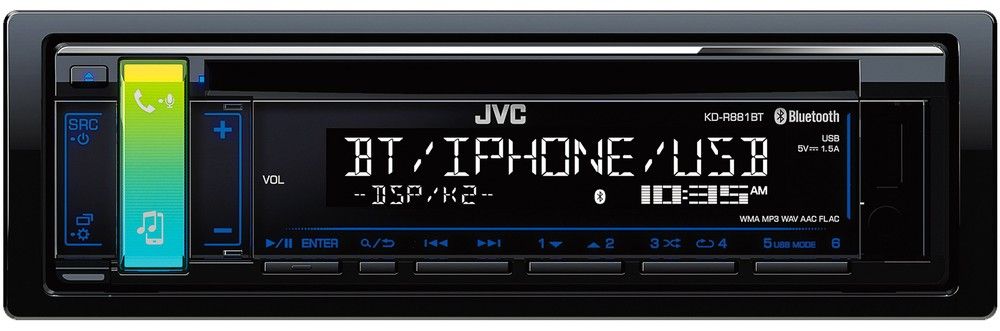 Bluetooth autorádio s CD přehrávačem od společnosti JVC je vybaveno FM/AM tunerem s podporou RDS informací a samozřejmostí je paměť pro uložení rádiových stanic. Kromě poslechu rádia můžete k přehrávání hudby použít i přední USB port. Další hudební zdroje lze připojit také do AUX vstupu a nechybí zde ani linkový výstup 2,5 V.