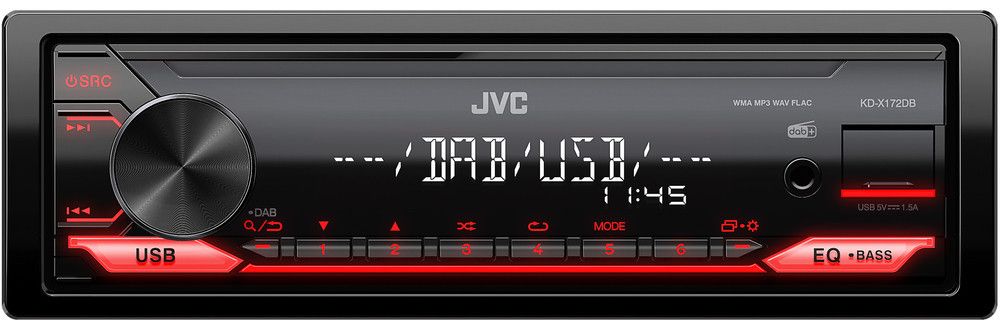 Autorádio s USB přehrává MP3/WMA/WAV/FLAC. Má červené podsvícení tlačítek.